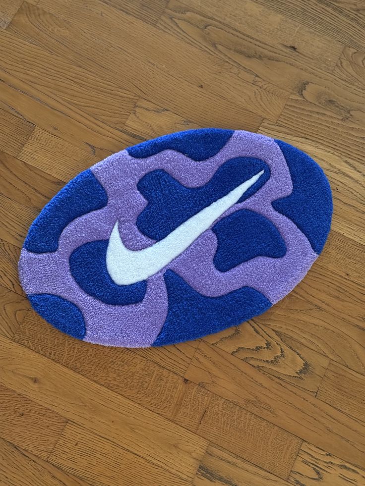 Apportez une touche d’originalité et de confort à votre intérieur avec ce tapis tufté fait main. Son motif abstrait aux nuances de violet et bleu, associé au célèbre swoosh blanc, en fait une pièce forte qui attire immédiatement le regard.